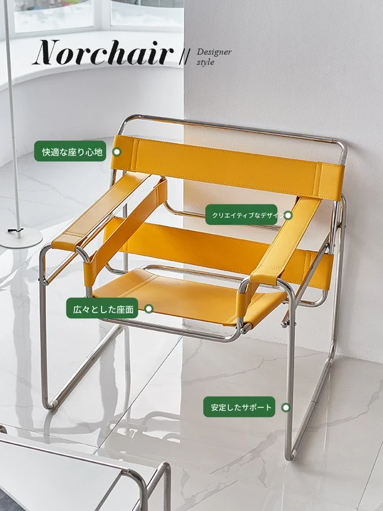 馬鞍革の椅子「ヴァシリー」北欧デザインの中古椅子、ステンレススチール製の一人掛け、バウハウス風のレトロでおしゃれなリラックスチェア。上質な素材と洗練されたデザインで、あなたの空間に特別な魅力を加えます!