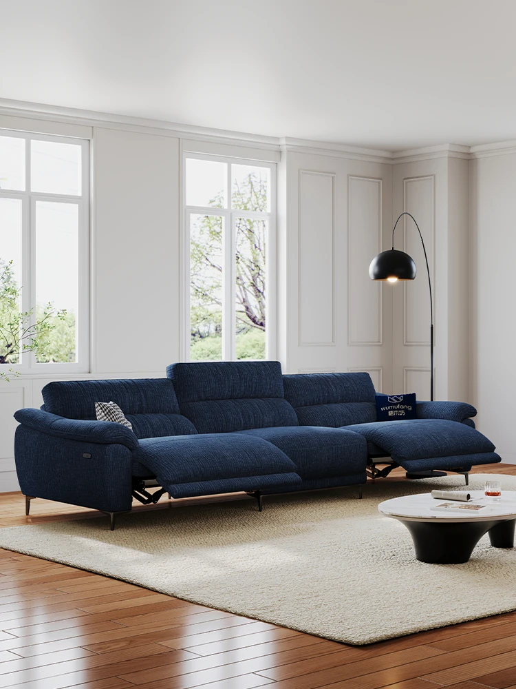 梧木坊のブルー電動機能ソファー - 宇宙船デザイン、壁に寄りかからないスタイル!柔らかい布製で、猫の爪にも強い麻素材使用。快適な座り心地でリラックス空間を実現!