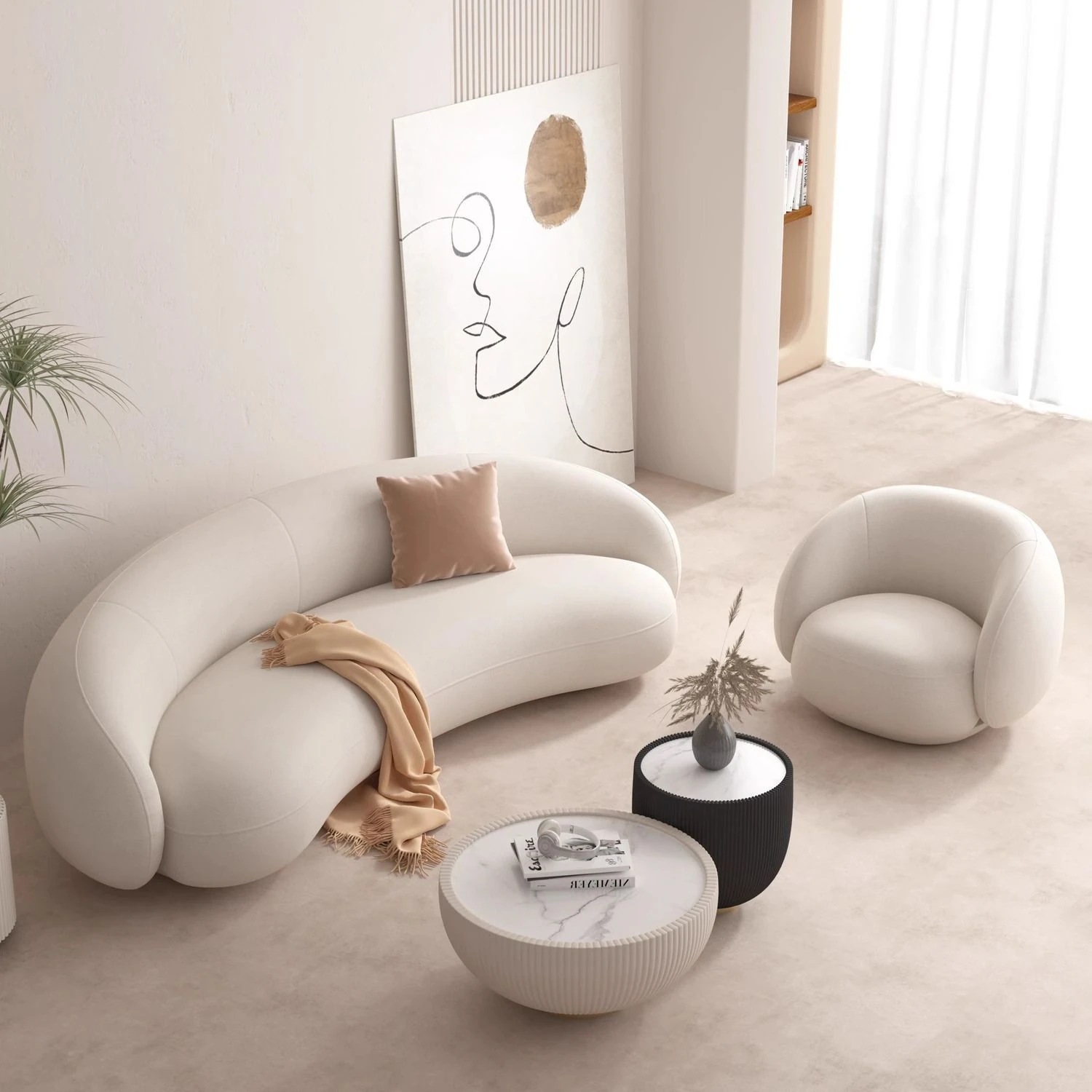 美容院や服装店にぴったり!北欧風クリームカラーのミニマリストアーチ型ソファ。休憩エリアをおしゃれに演出し、小さなリビングや寝室でも大活躍!快適なひとときを提供します。