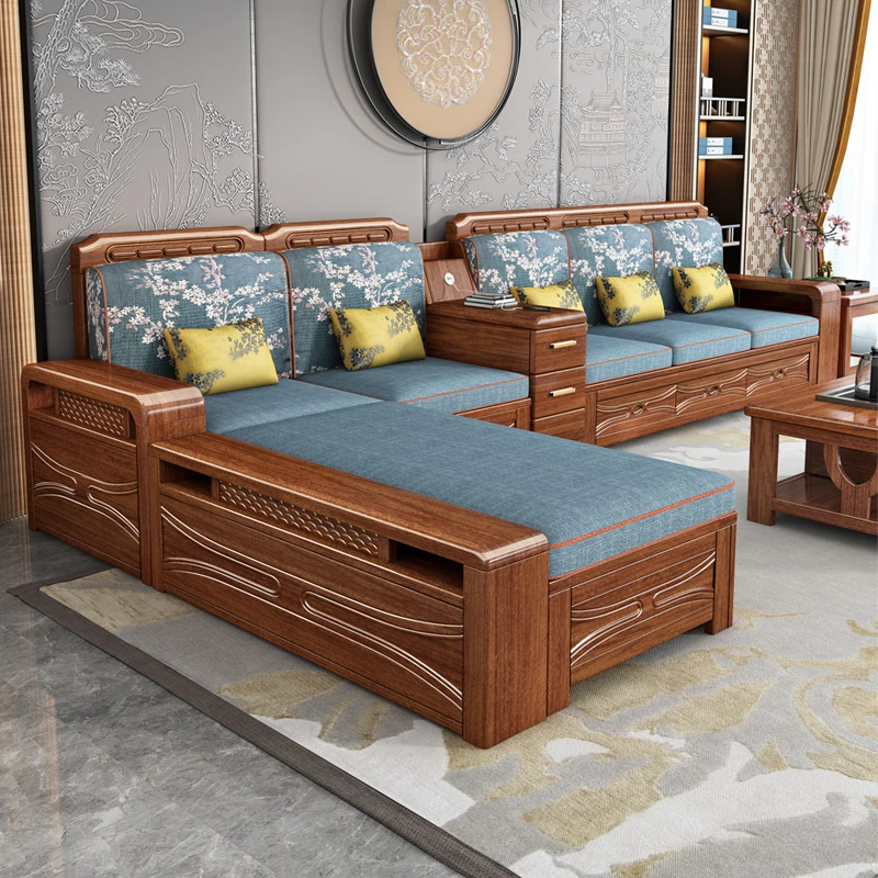 Expandable Walnut Sofa Bed with Drawers - Elegant Carved Solid Wood Design for Dual Use in Living Room - Perfect for Comfort and Storage