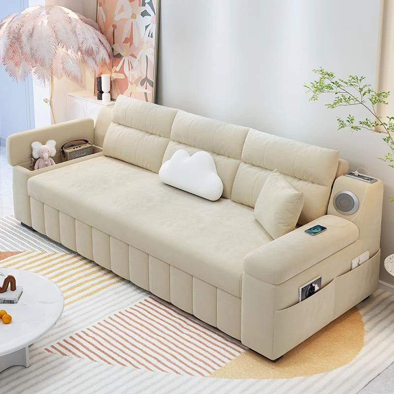 New Multifunctional Electric Sofa Bed for Small Spaces - Japanese Cream Style, Expanding Solid Wood Fabric Couch for Modern Living Rooms