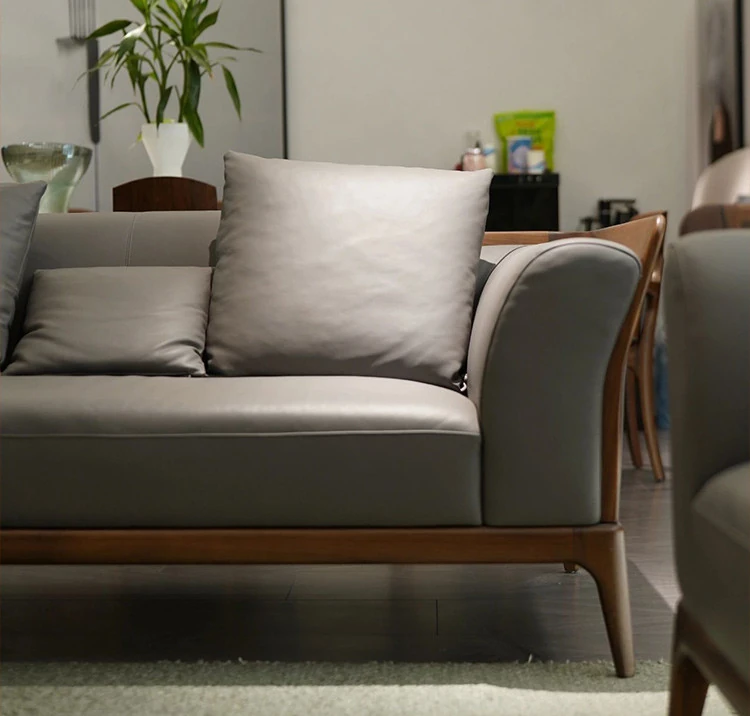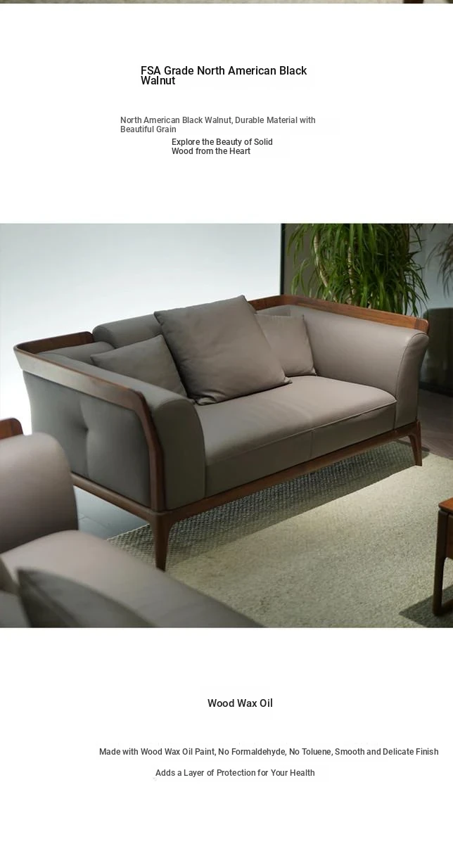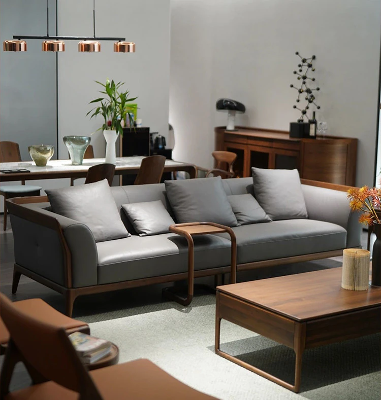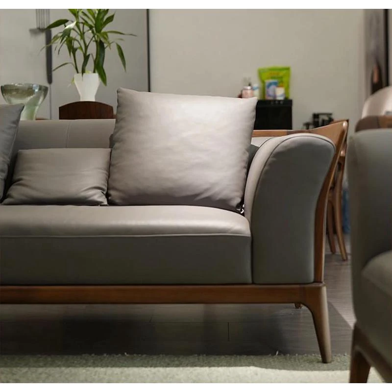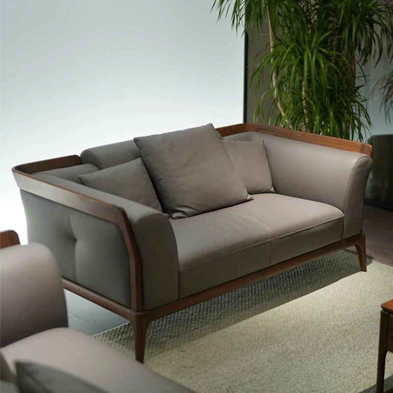 2025 New High-End Chinese Style Leather Sofa for Living Room - Walnut Wood and Faux Leather, Perfect for Small Spaces, Accommodates 3 to 4 People