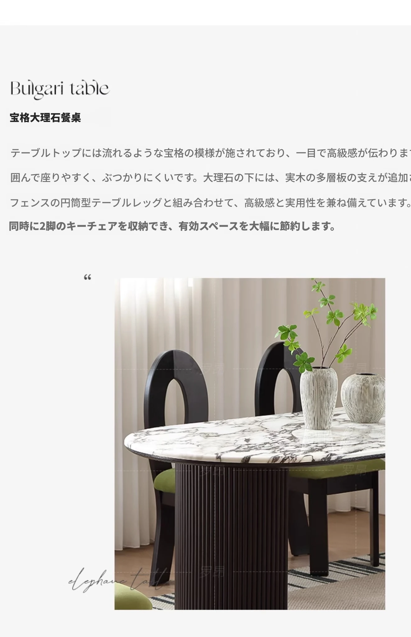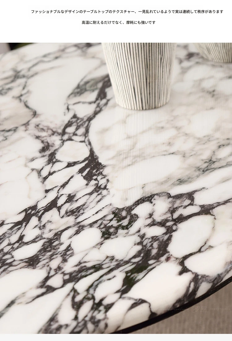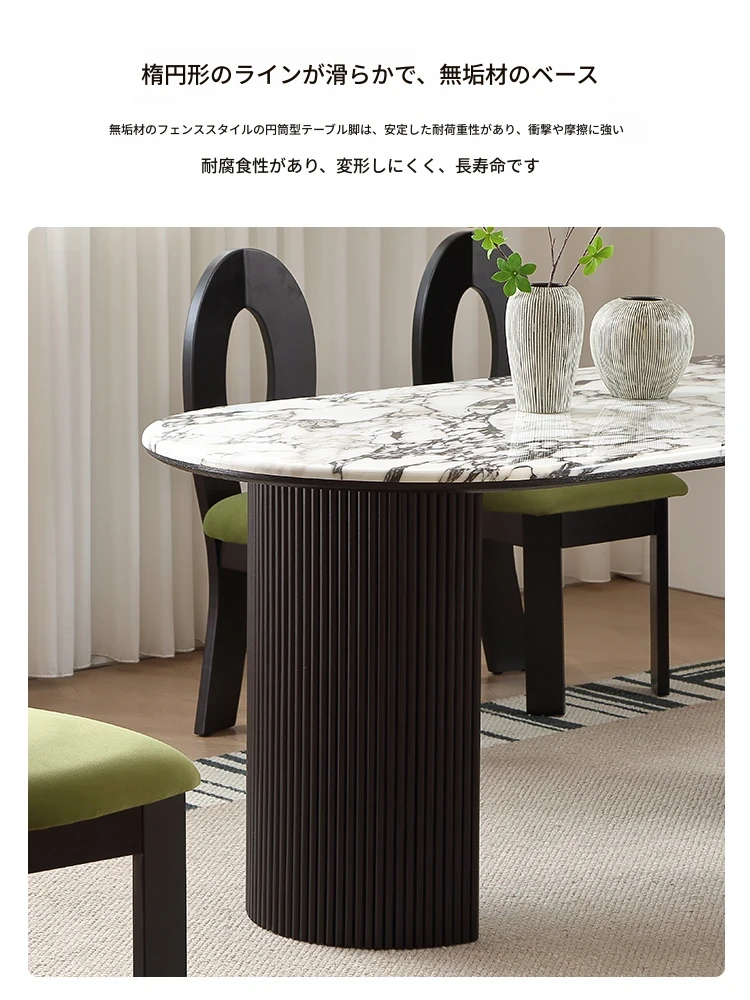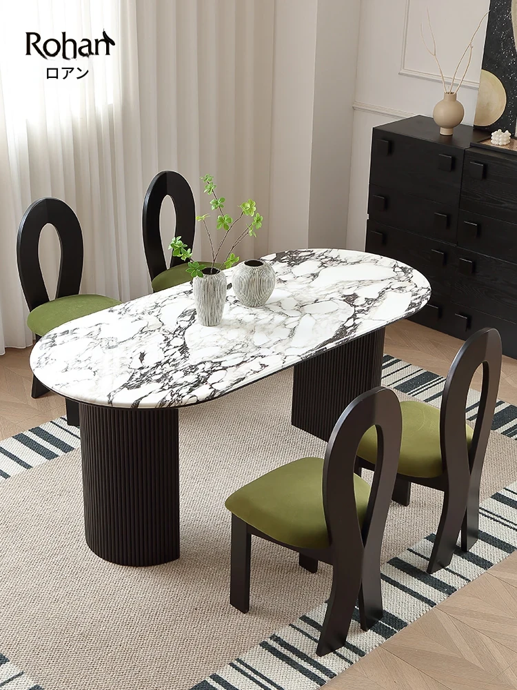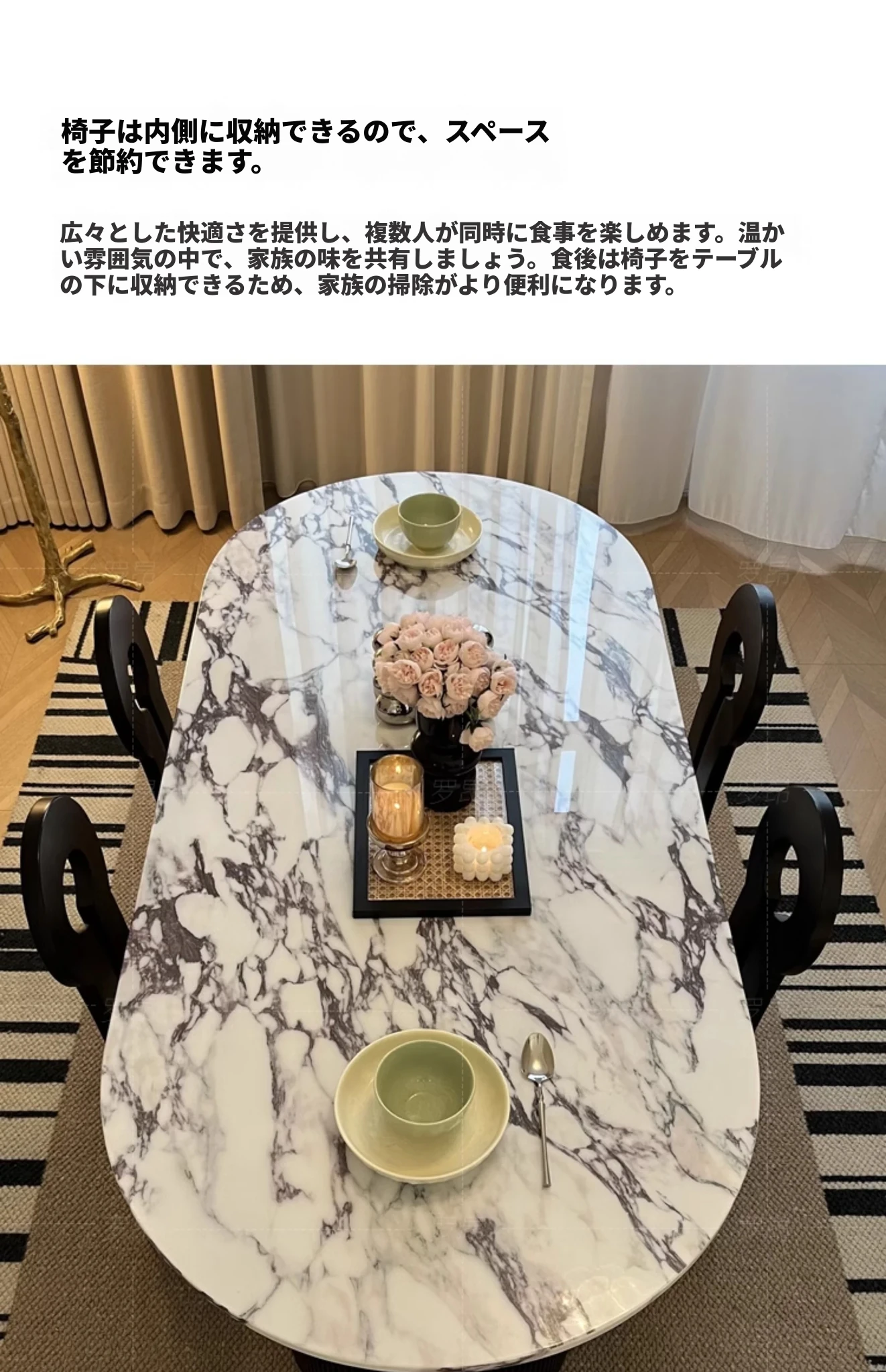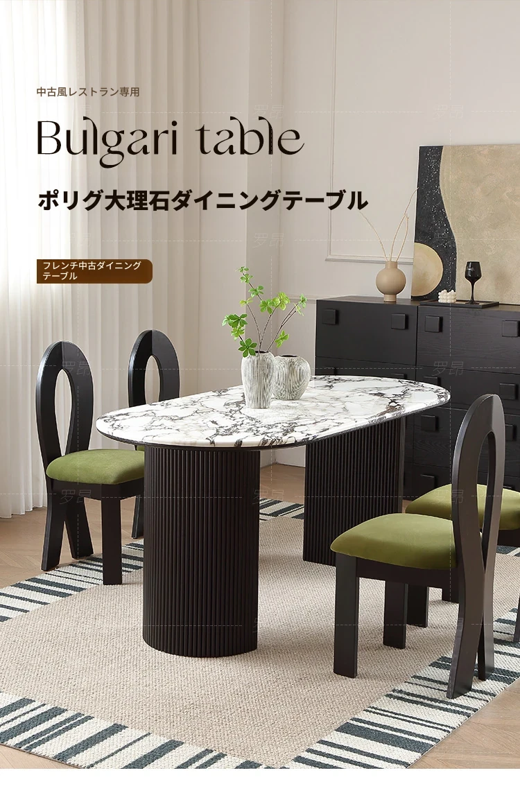 フレンチスタイルのブルガリ大理石ダイニングテーブル。太めのラタン脚で安定感抜群!小さな空間にぴったりなレトロ風の楕円形デザインで、軽やかなラグジュアリー感を演出。家庭用に最適な一品です。