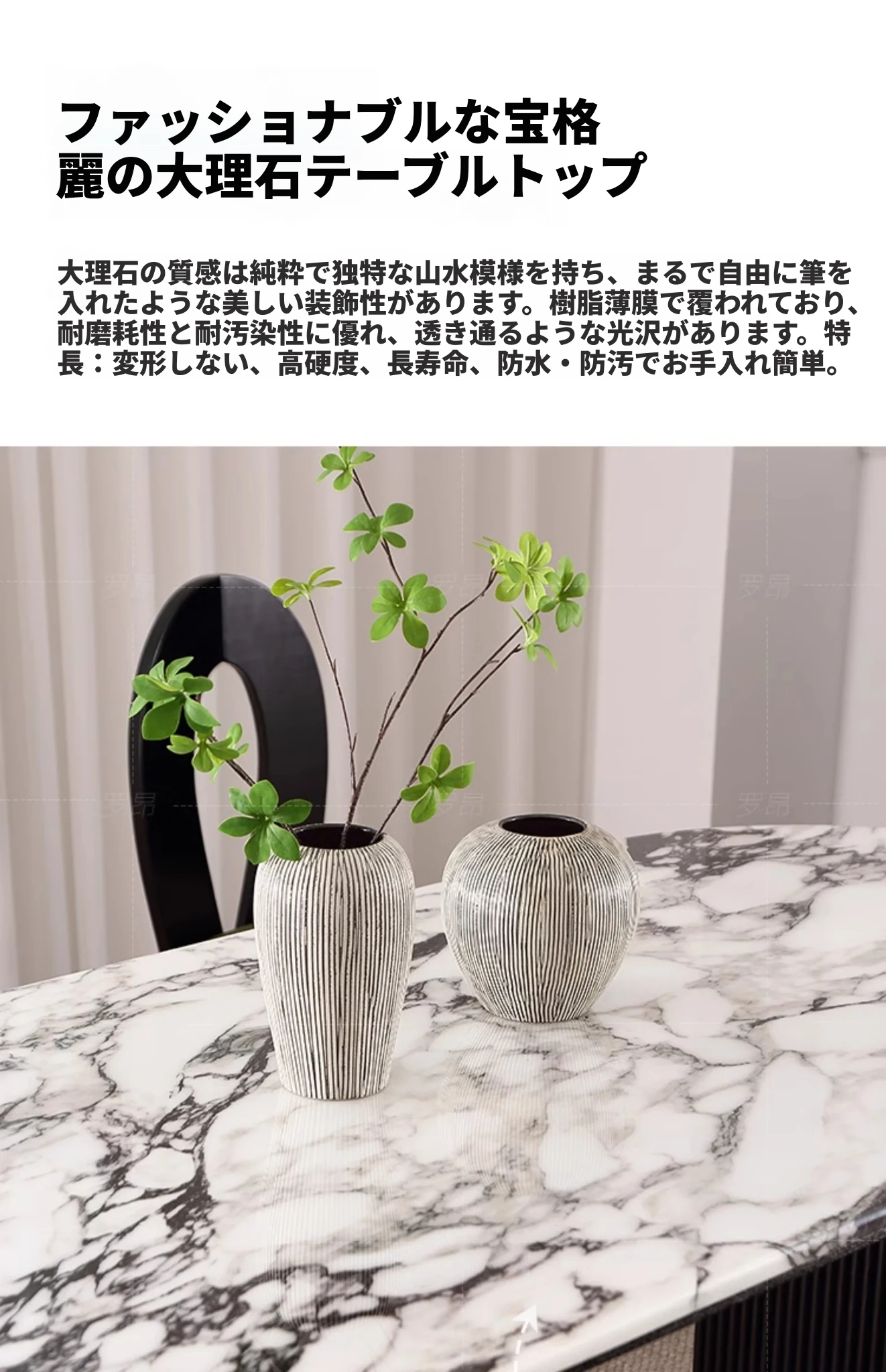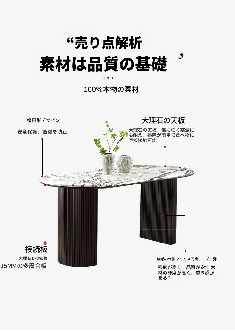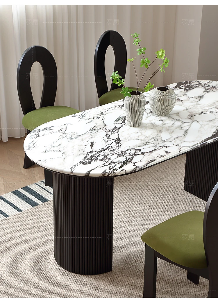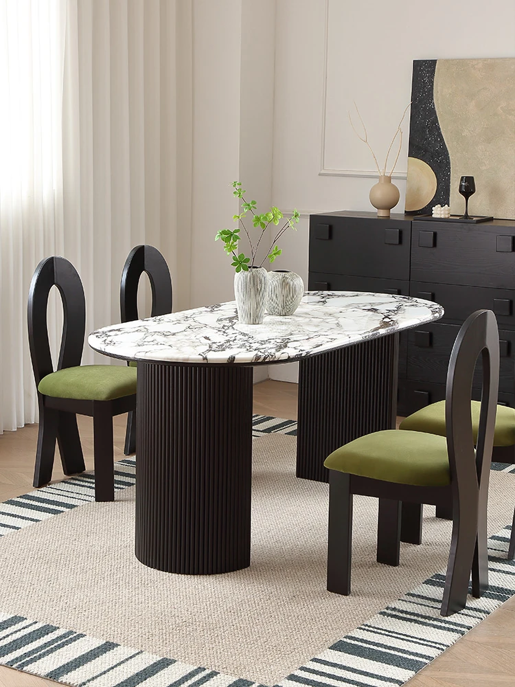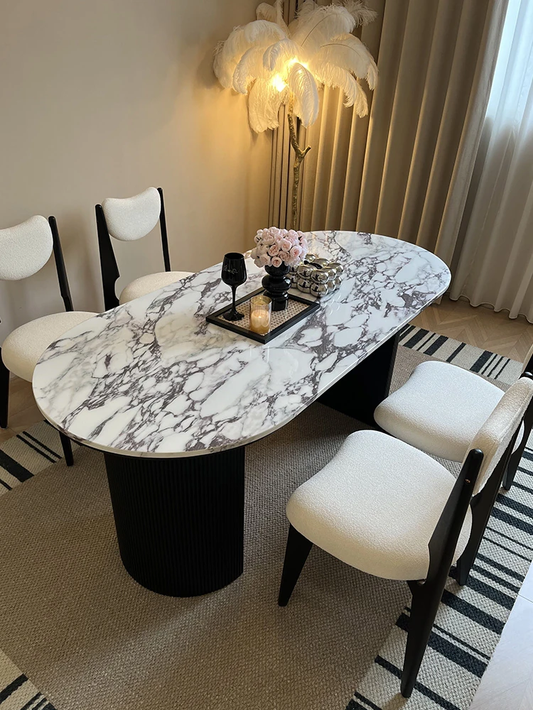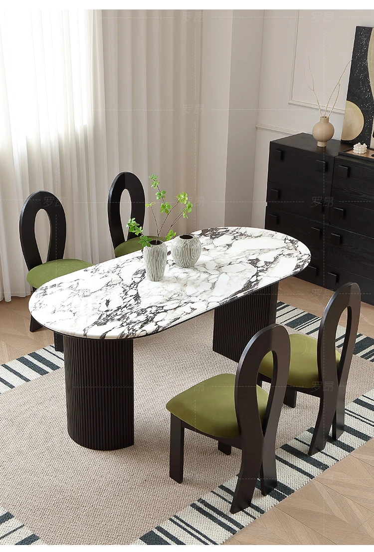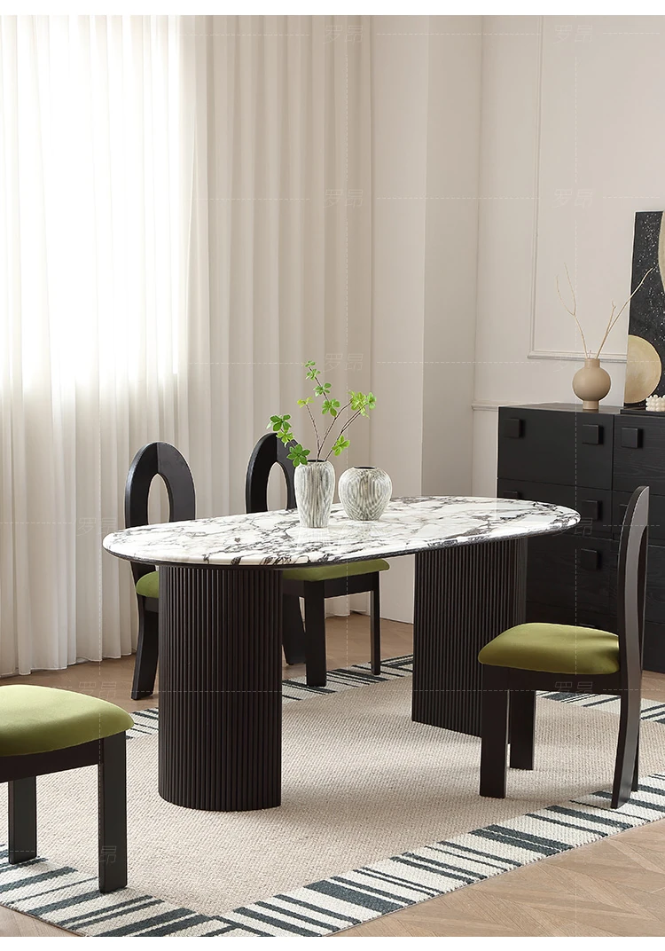 フレンチスタイルのブルガリ大理石ダイニングテーブル。太めのラタン脚で安定感抜群!小さな空間にぴったりなレトロ風の楕円形デザインで、軽やかなラグジュアリー感を演出。家庭用に最適な一品です。
