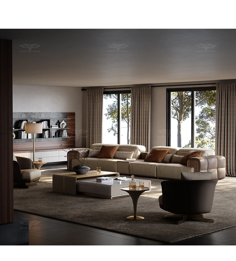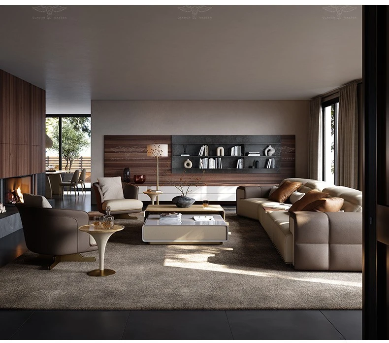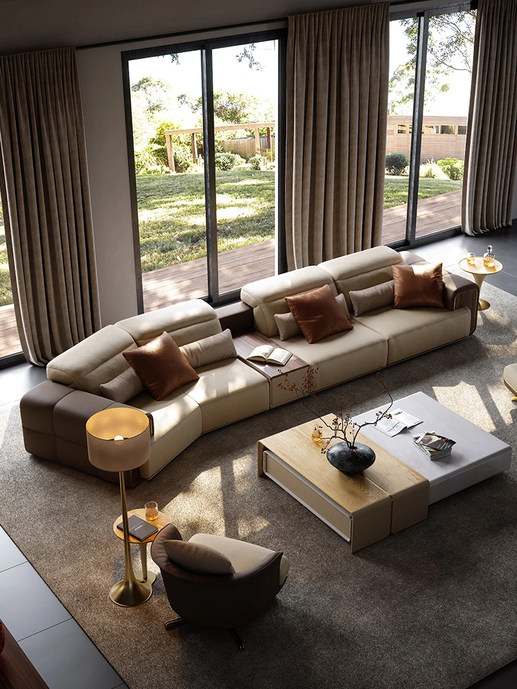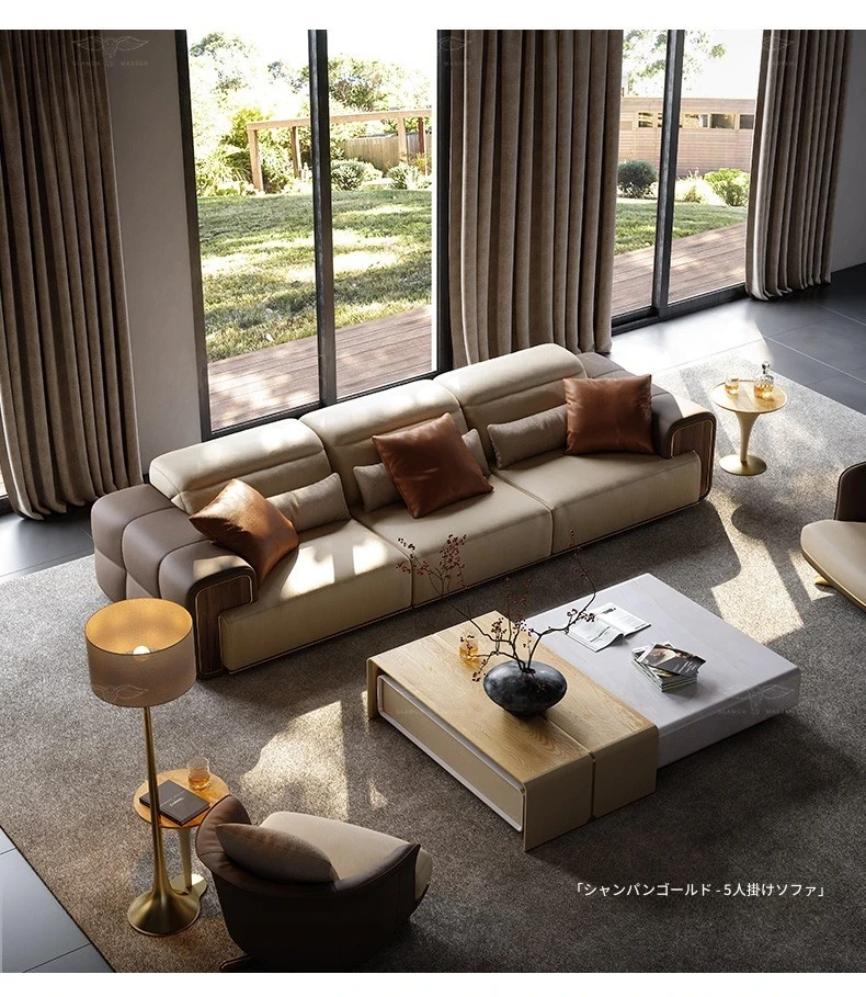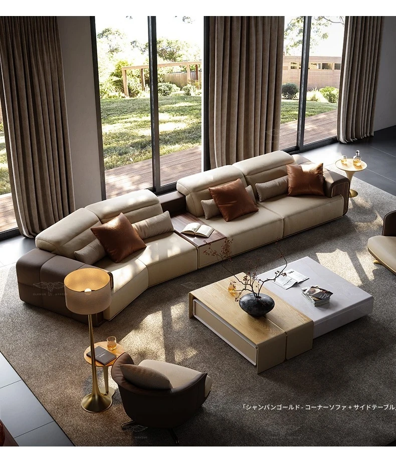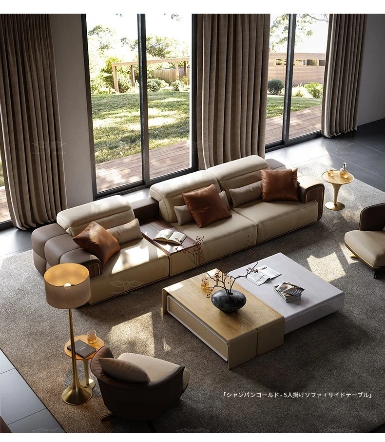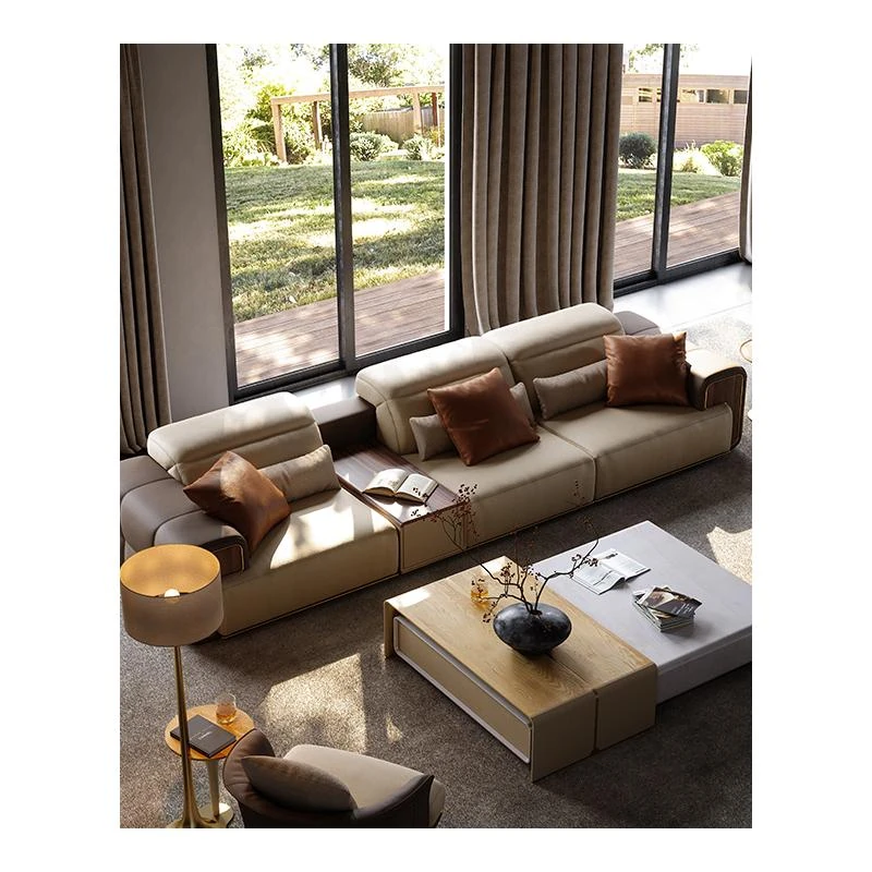 イタリアンミニマリストソファ - 豪華なヴィラの広々としたリビングにぴったりのモジュラーソファ。現代的なラグジュアリー感漂う本革使用で、快適さとスタイルを両立!