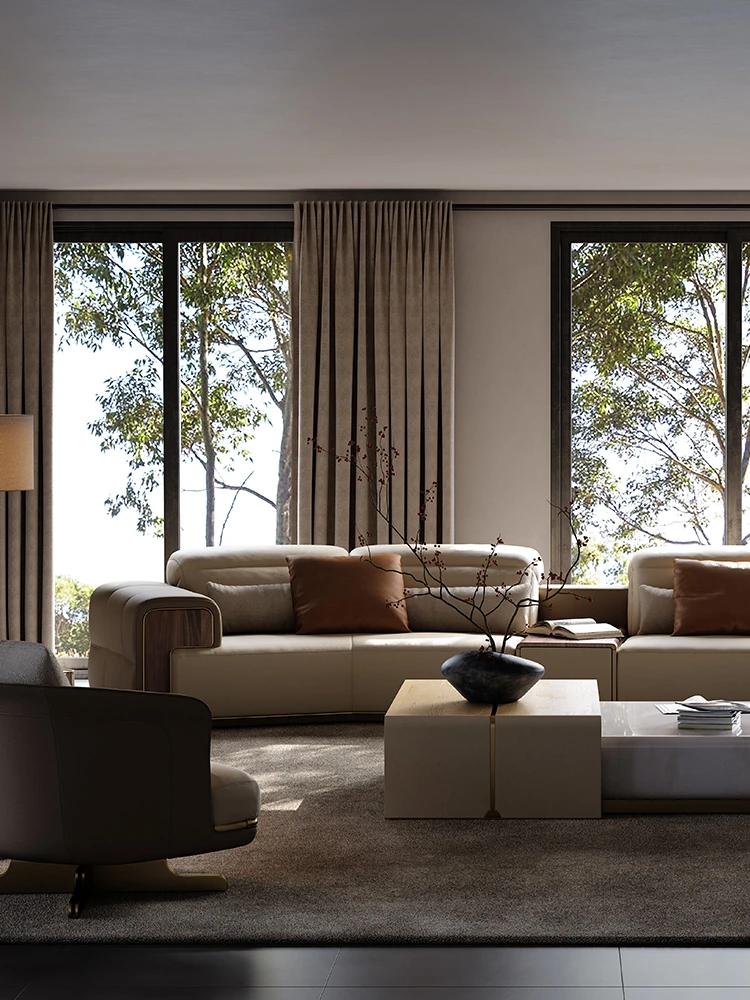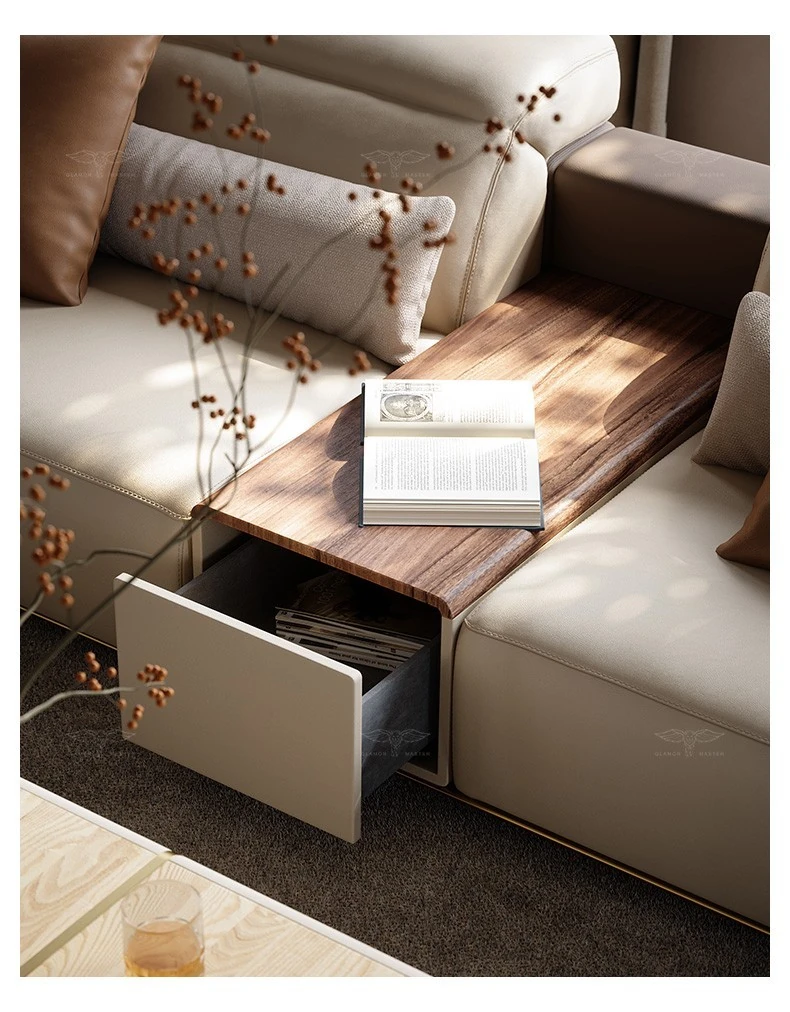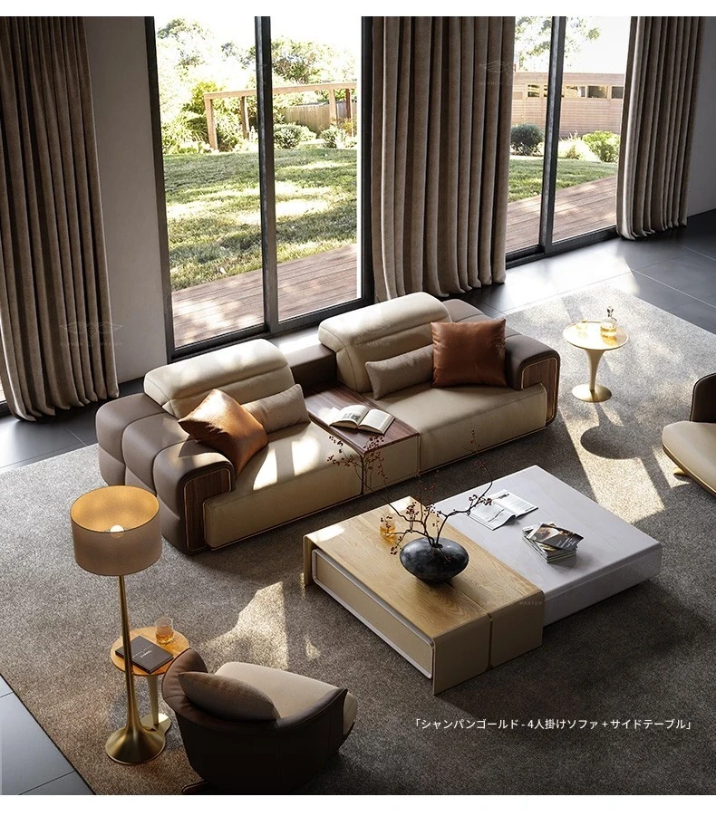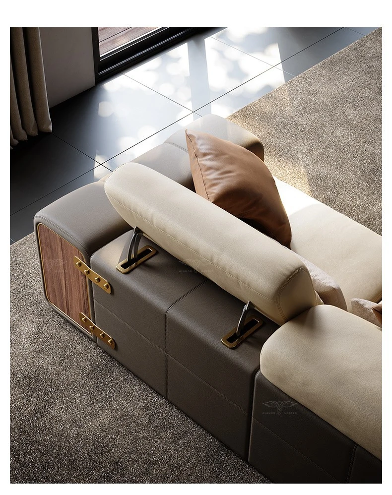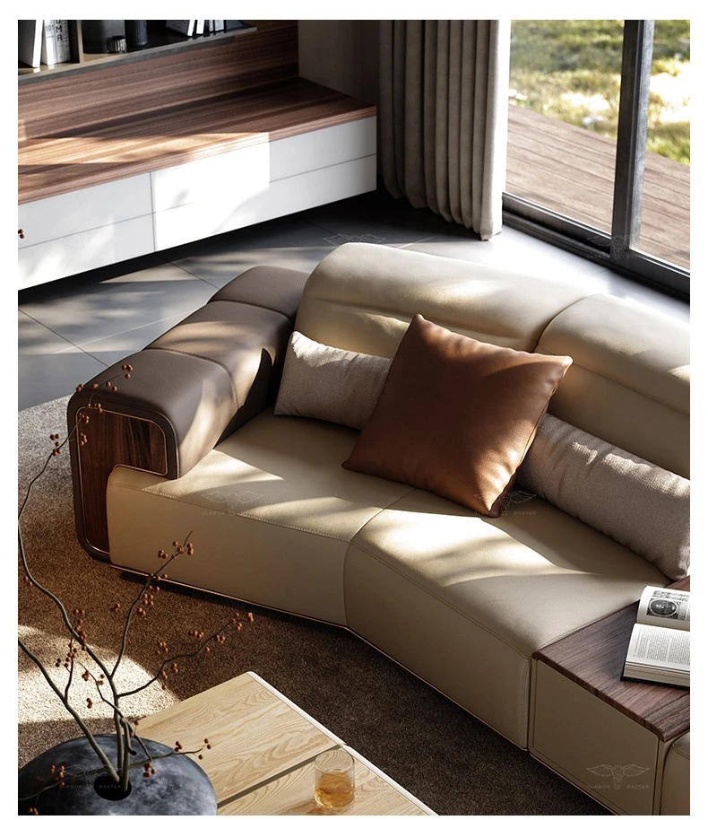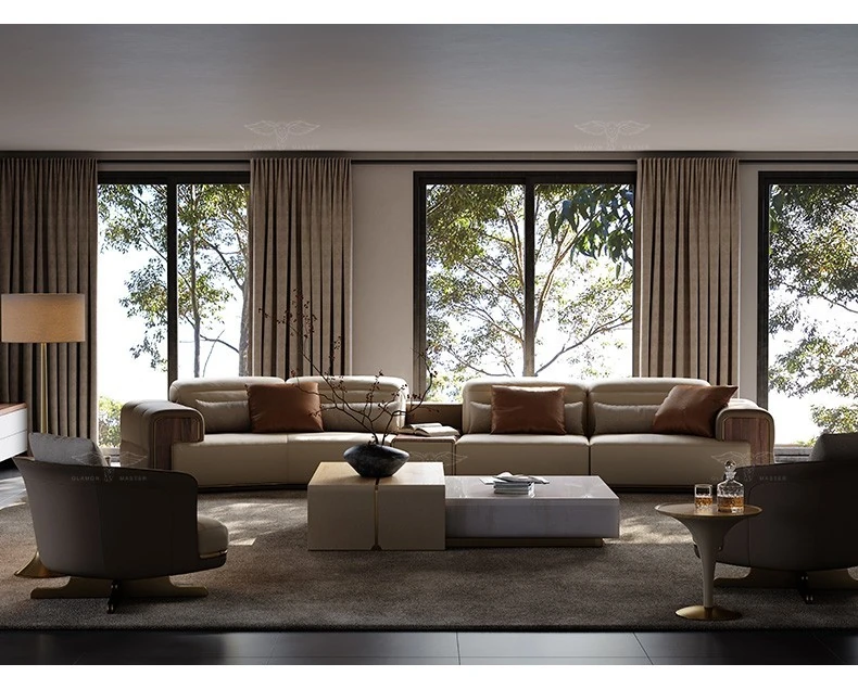 イタリアンミニマリストソファ - 豪華なヴィラの広々としたリビングにぴったりのモジュラーソファ。現代的なラグジュアリー感漂う本革使用で、快適さとスタイルを両立!