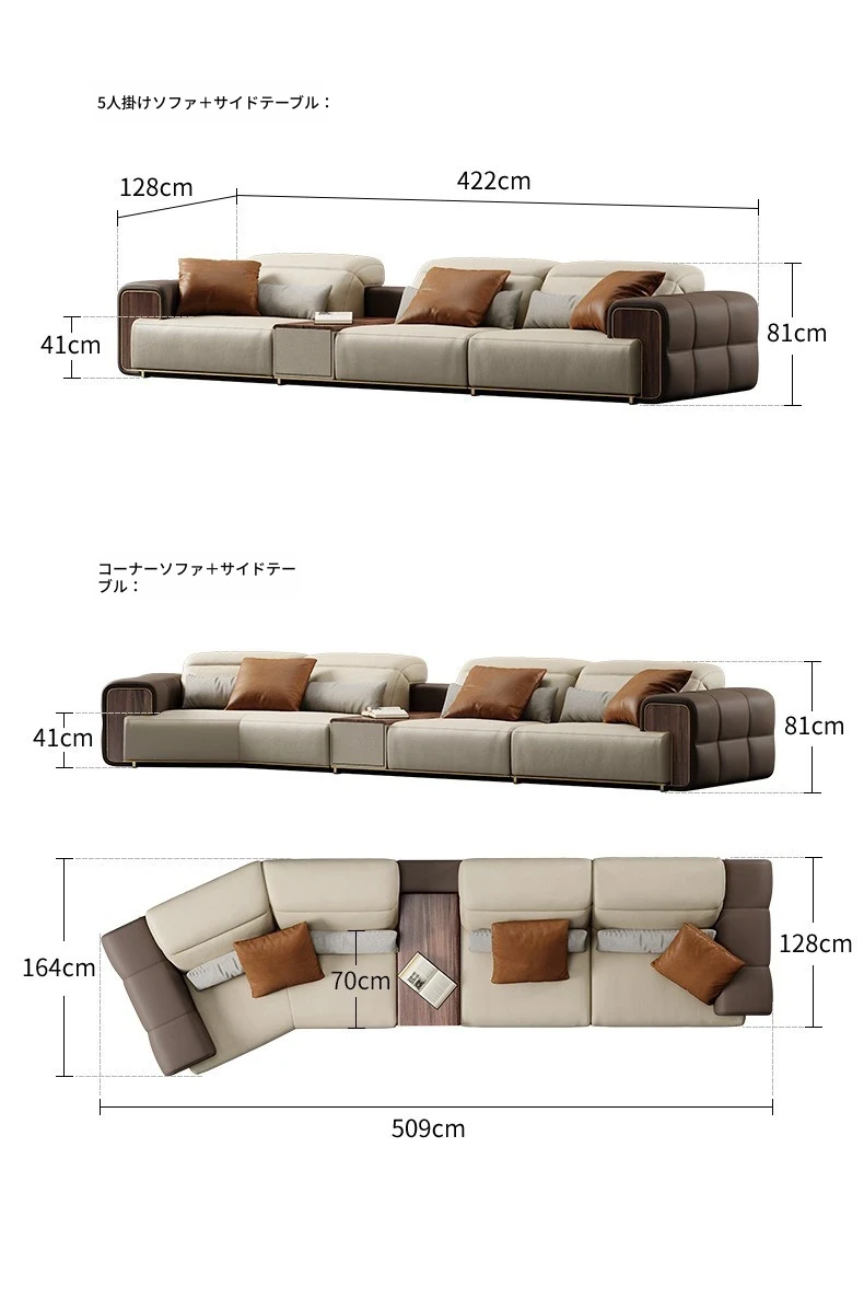 斜めコーナー組み合わせ+サイドテーブル5.09M/S級本革/南米ウォールナット