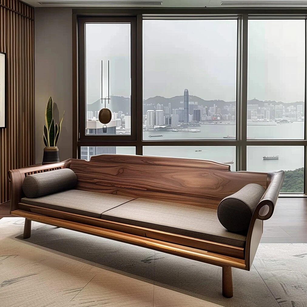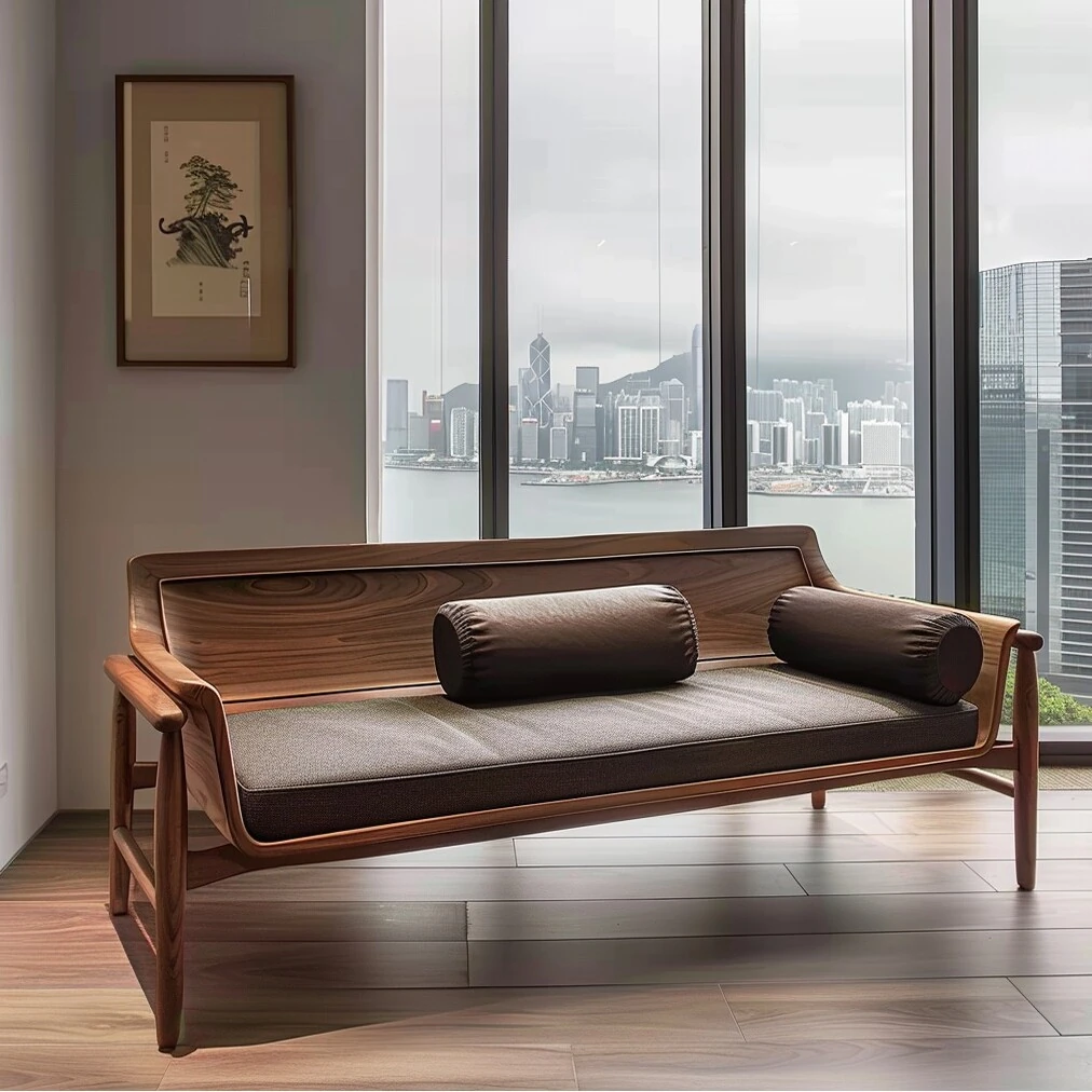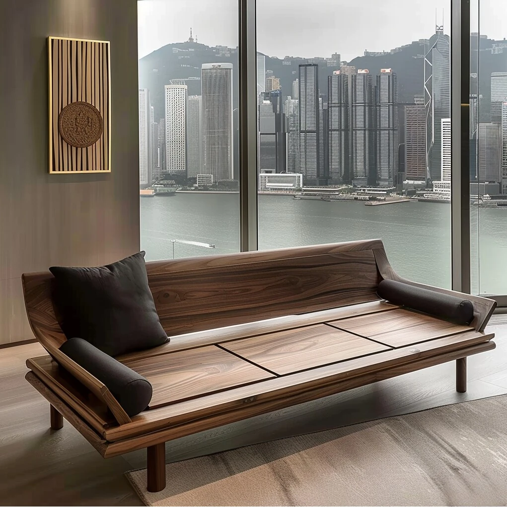 北米産ブラックウォールナットとホワイトアッシュを使用した新中式のローハンベッド。豪華でモダンなデザインは、オフィスやホテル、民宿にぴったりの貴婦人のような優雅さを演出します。