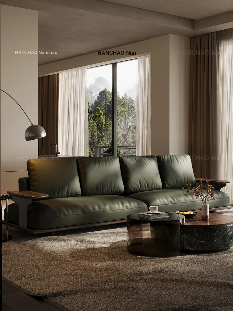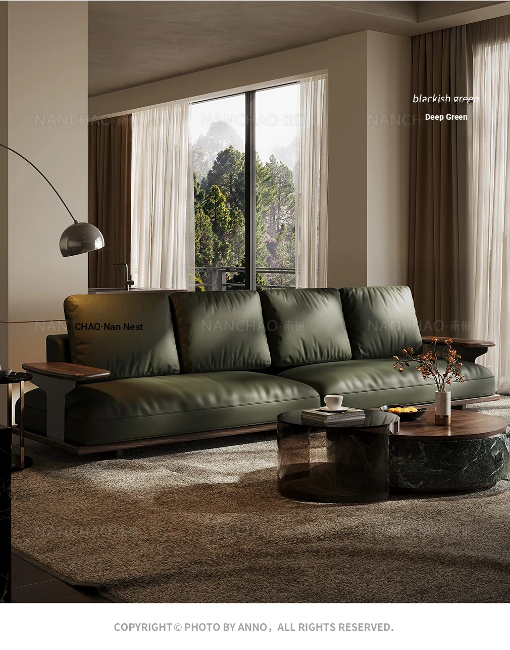 Modern Minimalist Italian-Style Sofa in Black Walnut Wood with Genuine Top-Grain Leather - Ideal for Small Spaces, Features Elegant Dark Green Color and Solid Wood Construction