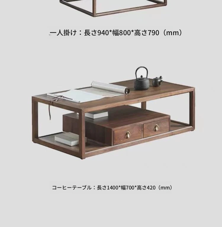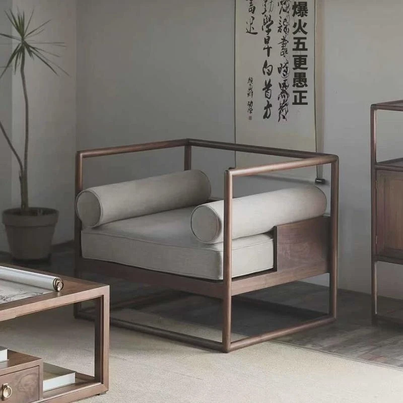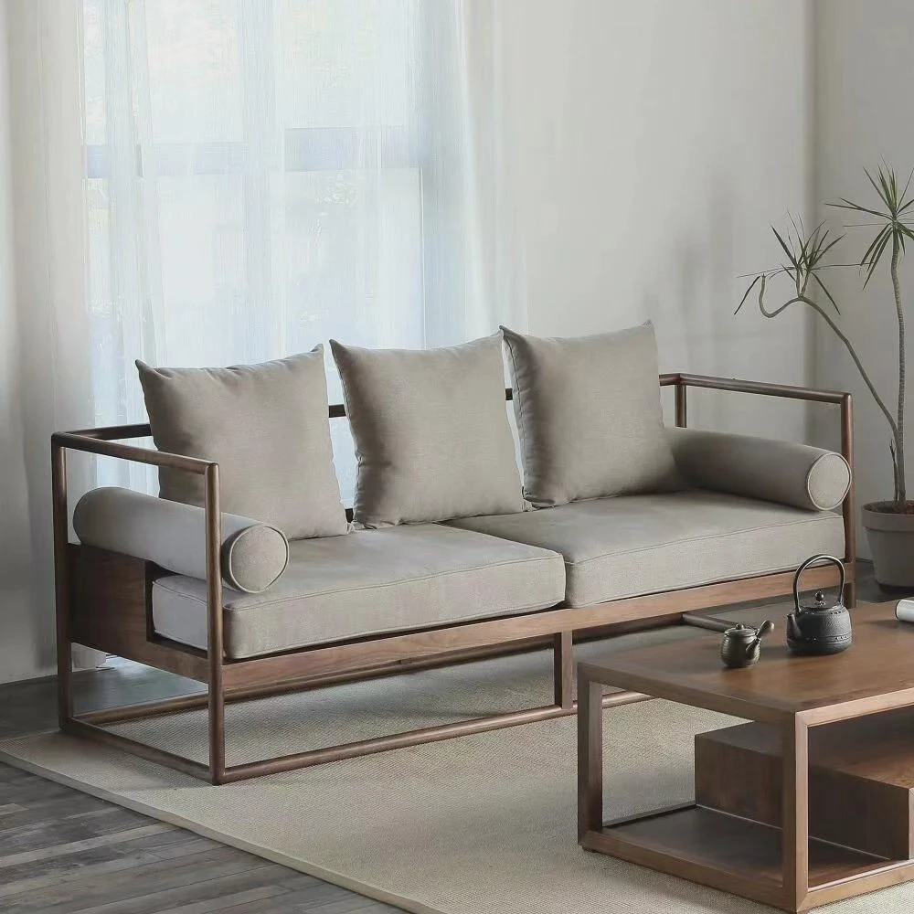 新中式スタイルの無垢材ソファセット|柔らかな布張りとモダンなデザインが魅力|禅の雰囲気漂うリビングに最適|コンパクトな小型住宅にもぴったりなウォールナット家具