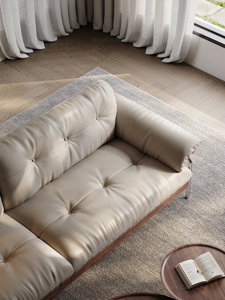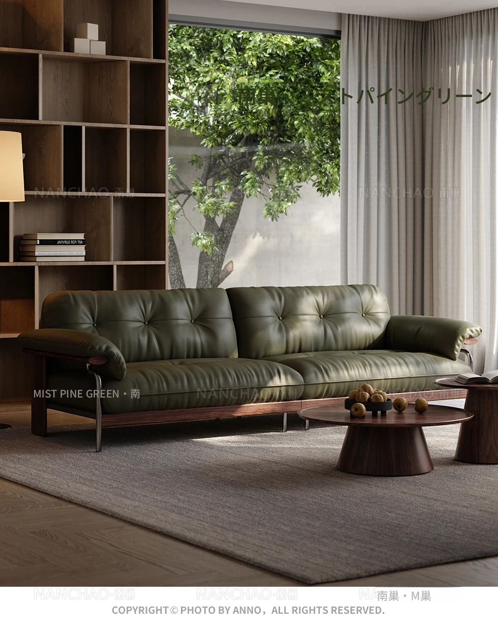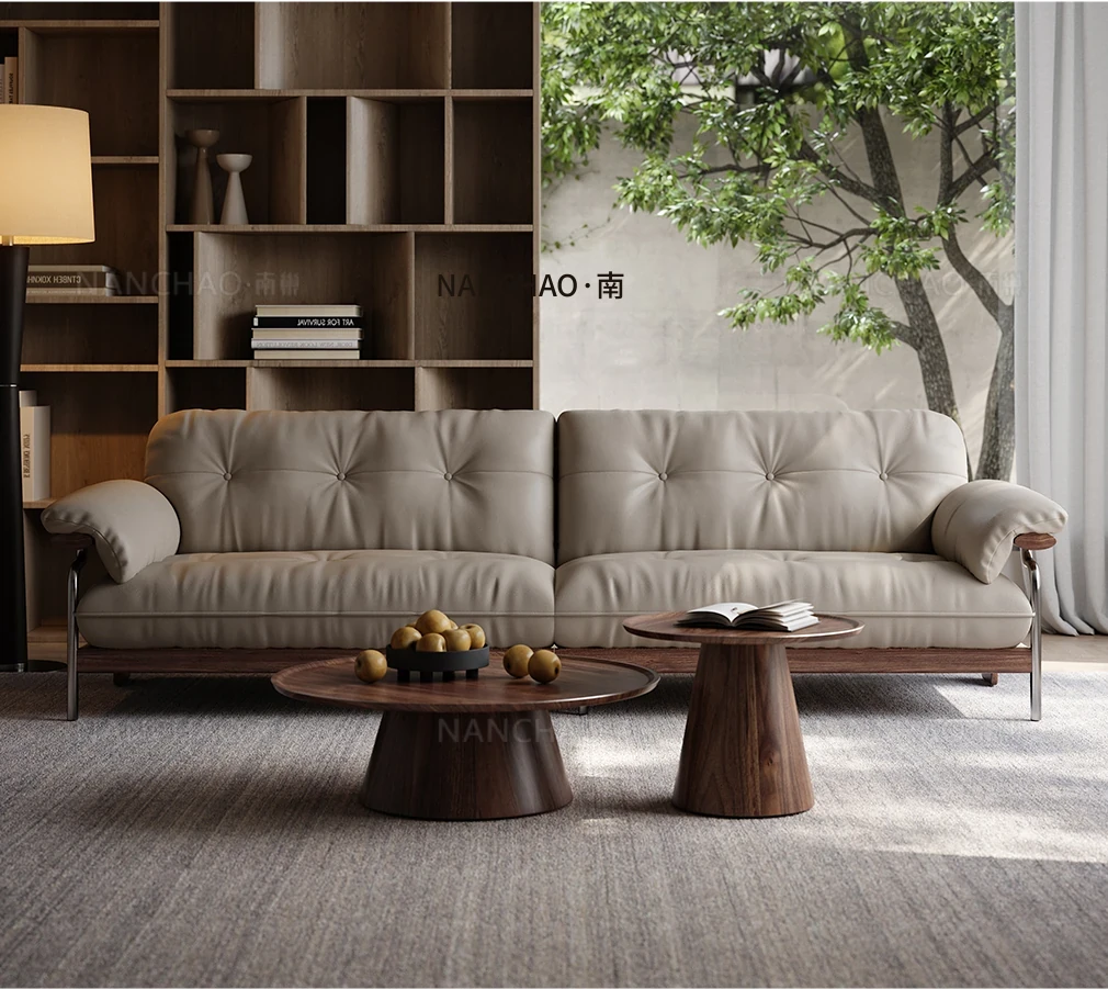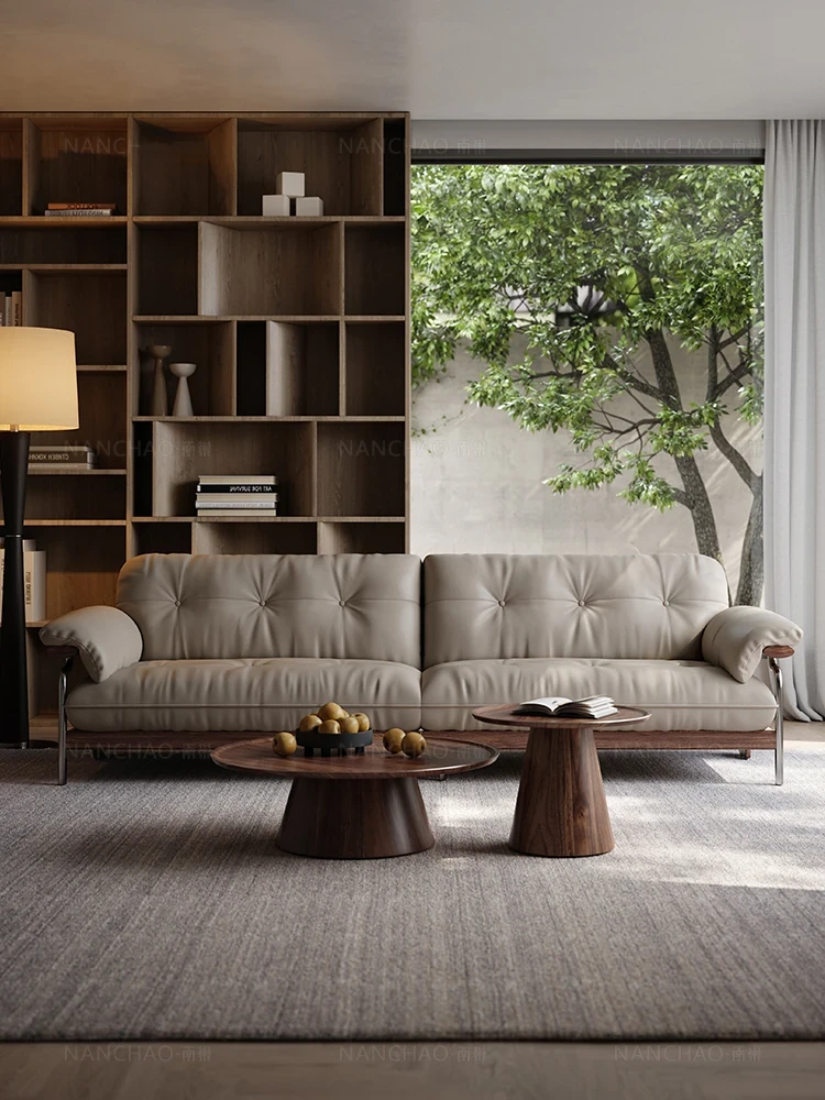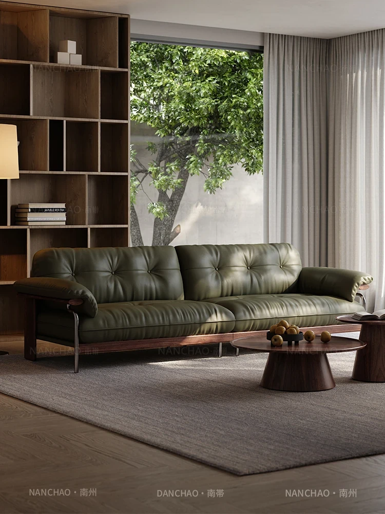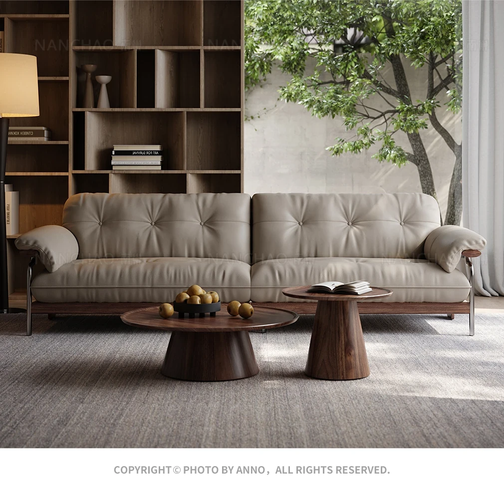 高級感あふれる本革ソファー - ブラックウォールナット無垢材使用、全居室対応!2025年新作、小型住宅向けのスタイリッシュな直排デザイン、上質な黒色でインテリアを格上げ!