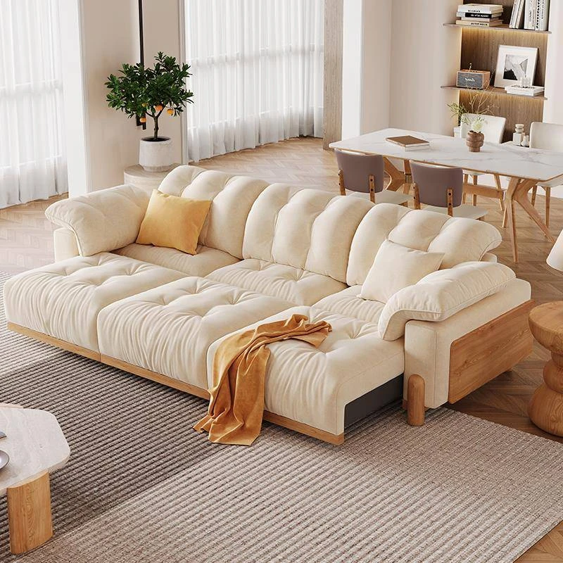 リビングにぴったり!電動ソファベッド 小型住宅向け 日本風クリームカラー 新作 多機能 伸縮式 棚付き 天然木製 ファブリックソファで、快適なひとときをお楽しみください。