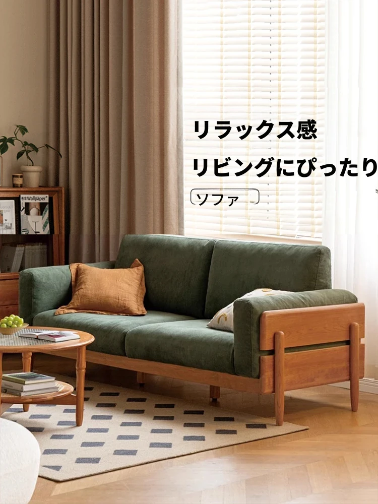 天然無垢材使用!レトロなチェリーウッドの三人掛けソファ。小さなリビングにもぴったりなスタイリッシュなデザインで、居心地の良い空間を演出します。シンプルで美しい直線的なフォルムが、あなたの家に温かみをプラスします。